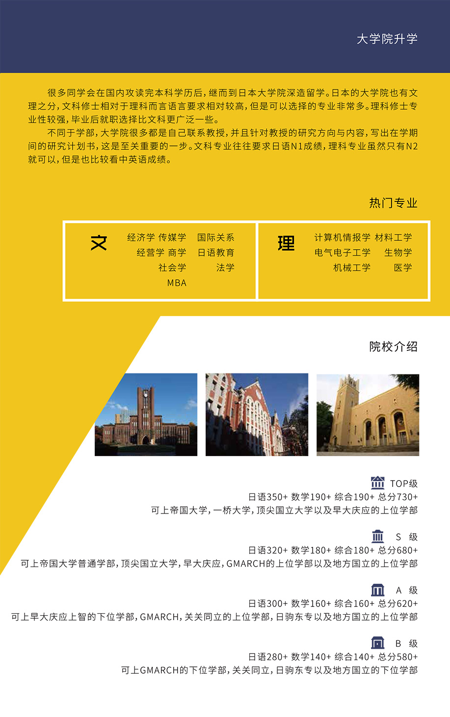 为在中国有4年本科学士学位的学生提供各种日本大学研究院的信息,帮助学生制定研究课题及研究计划。培养学生了解日本各种大学研究院的专业研究内容及特色,尽快找到理想的导师,选择适合自己的学校和专业。